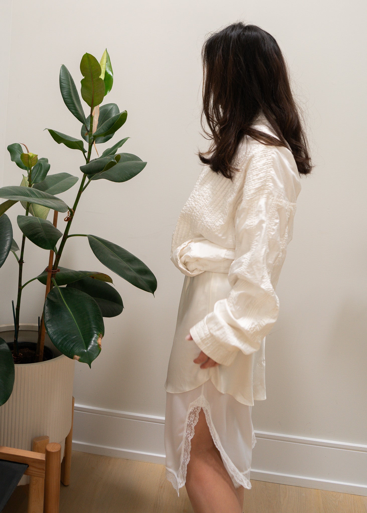 Details: snow white nearly sheer lightweight nylon fabric, thin elastic waistband, column shape slip skirt, midi length, flat lace trimmed hem, 9.5" lace lined slits on both side seams, waist is very stretchy, fabric has some stretch, unlined
